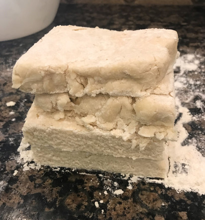 After you’ve cut the butter into the flour and added the milk, you dump it out on the counter and attempt to get the dough to come together. It probably won’t look like dough yet, just clumpy flour. If that’s the case, give it a light knead with your hands until it just comes together and roughly shape it into a rectangle. Don’t overwork this dough. I can’t stress this enough—if you do, you’ll melt the butter and then it’s no good. The dough rectangle’s height depends on your own personal preference, and on how many biscuits you wanted to make. Next, you’ll want to cut your dough rectangle into four even segments and stack them on top of each other, like so.